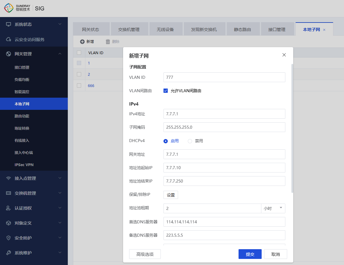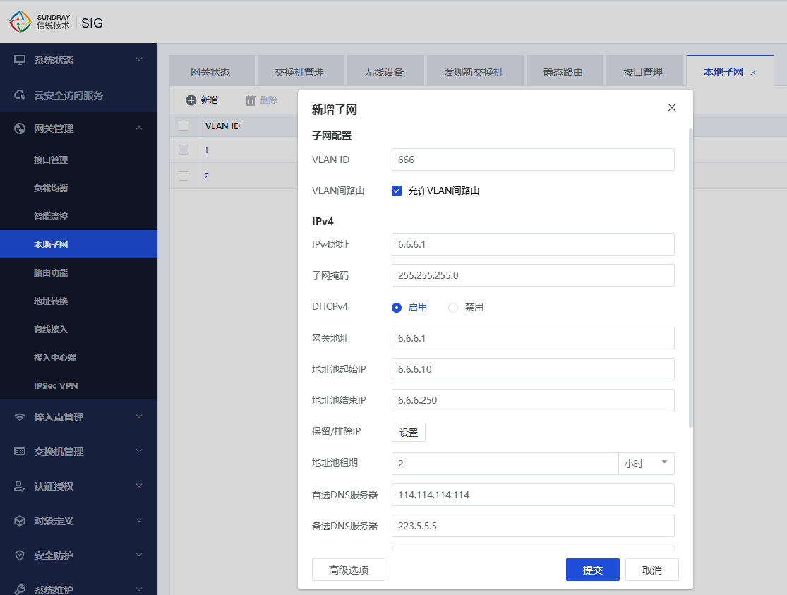 1、在【网关管理】-【本地子网】里,按照地址规划表,新增不同的vlan子网,并开启DHCP服务;