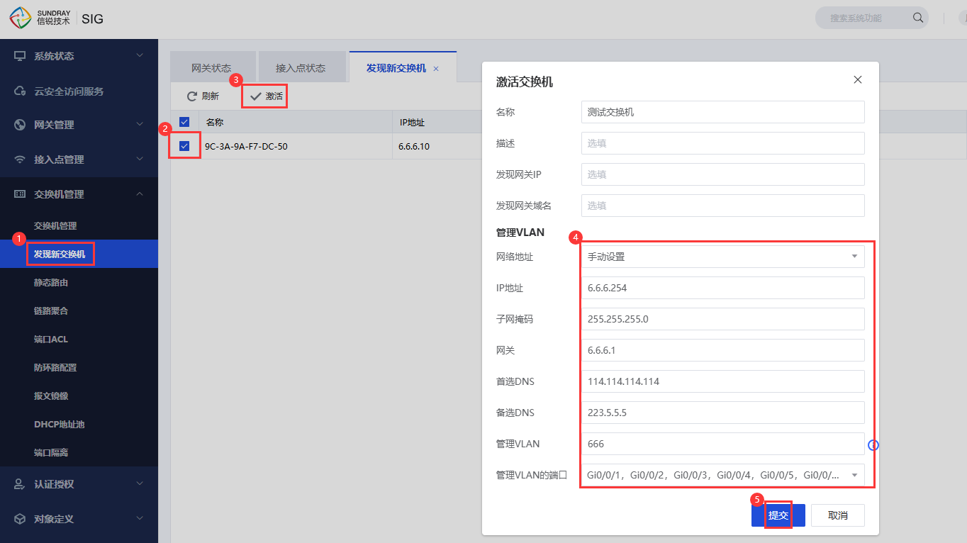 1、在【交换机管理】→【发现新交换机】能够看到发现新的交换机,依次配置管理地址、管理vlan、管理端口,激活上线即可;