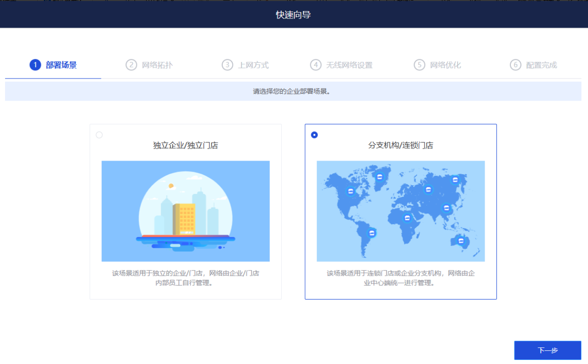 1、开局部署场景选择“分支机构/连锁门店”,然后点击下一步;