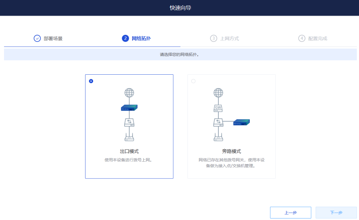 2、网络拓扑选择“出口模式”,然后点击下一步;