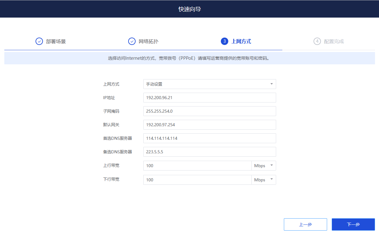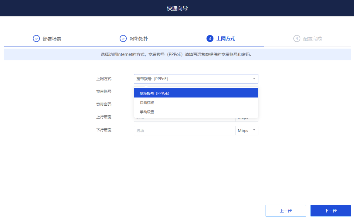 3、上网方式根据实际分支场景配置,然后点击下一步;