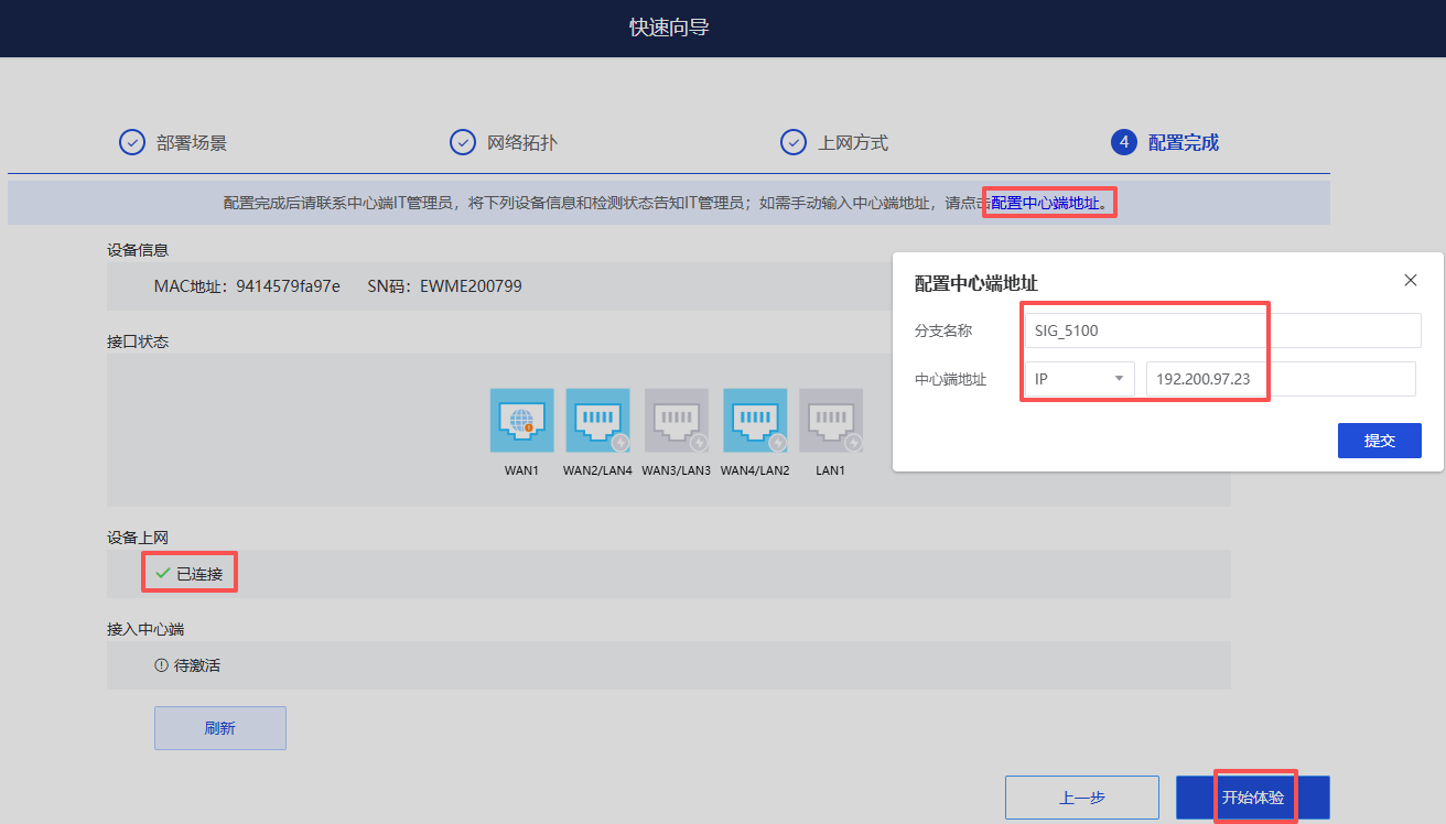 4、【配置中心端地址】,为总部NMC的出口公网地址,提交后点击【开始体验】。