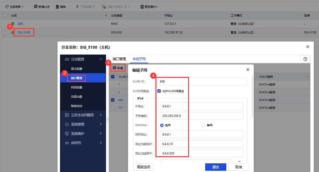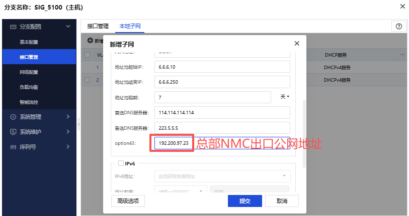 1、在总部NMC上配置分支SIG的本地子网,新增vlan666,开启DHCP服务,并配置option 43字段为总部NMC的公网地址;