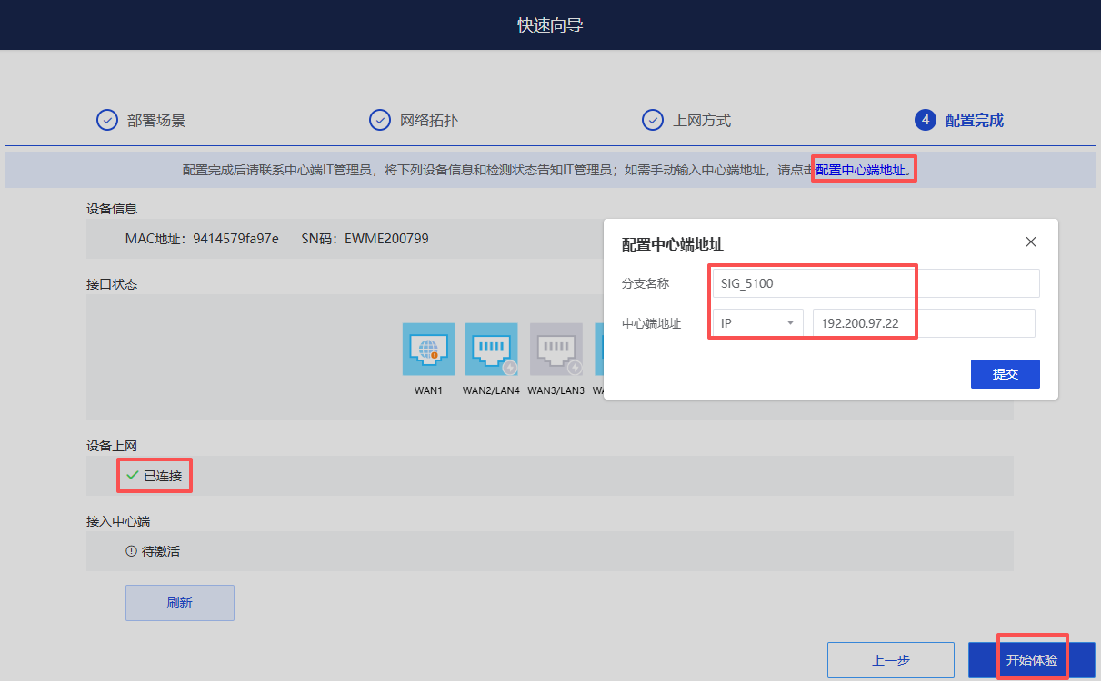 4、【配置中心端地址】,为总部NMC的出口公网地址,提交后点击【开始体验】。