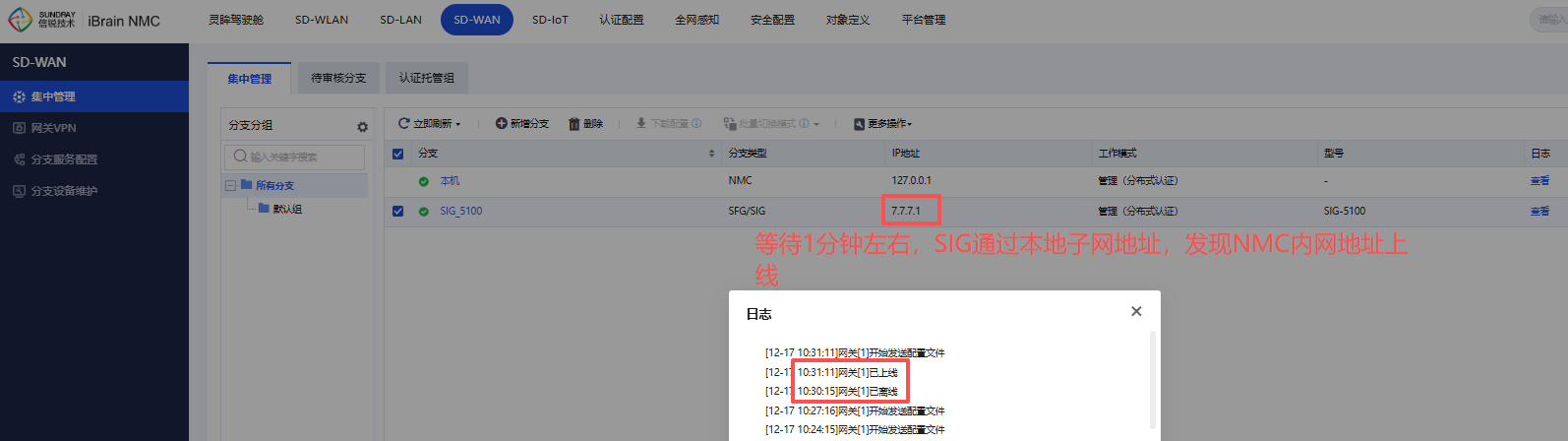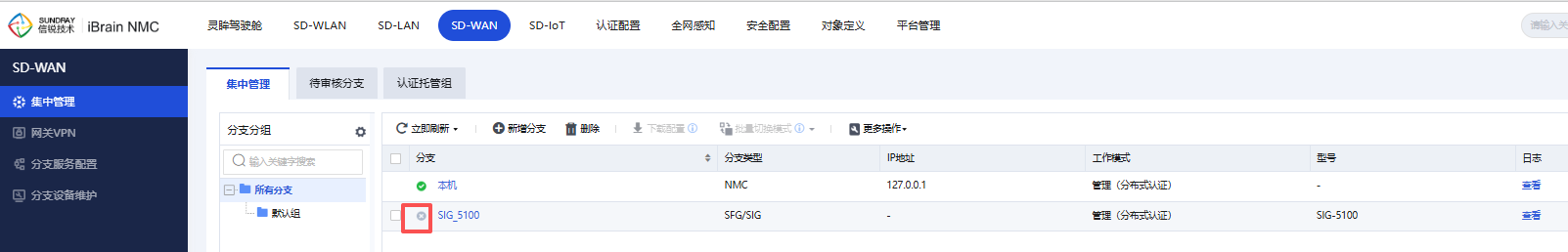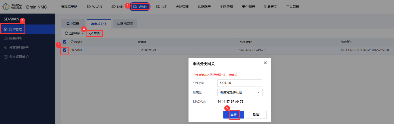 5、在总部NMC上审核分支SIG,可以看到SIG以公网地址上线到NMC。