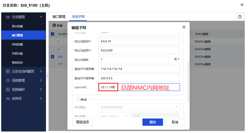 1、在总部NMC上配置分支SIG的本地子网,新增vlan666,开启DHCP服务,并配置option 43字段为NMC的内网地址;