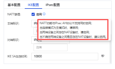 【IP地址】:当【地址类型】选择“对端是固定IP”时必填,此处填写VPN对端公网地址。当【地址类型】选择“对端时固定域名”时,此处填写VPN对端域名。当【地址类型】选择“对端是动态IP”时,此处无需填写,自动隐藏;