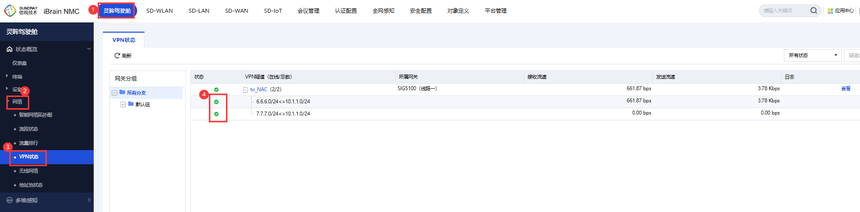 4、在【灵眸驾驶舱】-【网络】-【VPN状态】里,可以查看刚创建的VPN策略变为“已连接”。
