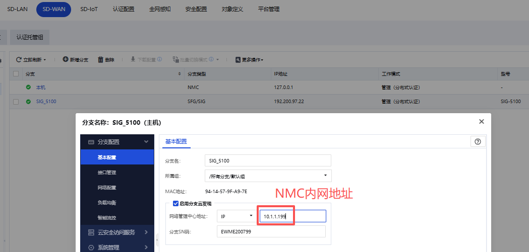 1、在NMC平台里,选中对应分支SIG,勾选“启用分支云发现”,配置IP为总部NMC的内网IP地址。