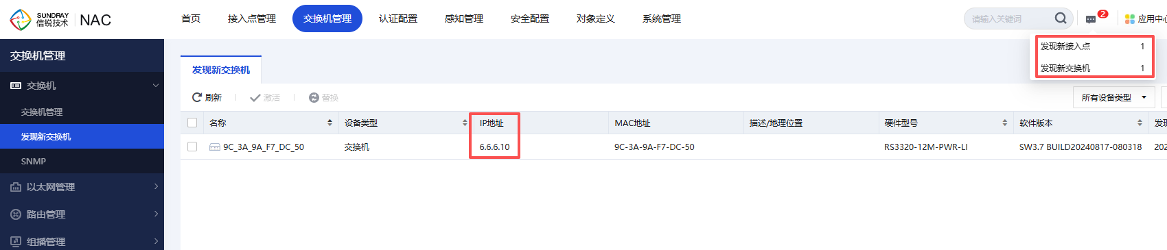 1、VPN组网成功后,在总部NMC上可以自动发现分支SIG下的AP、交换机,点击激活上线即可。