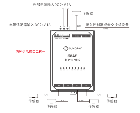 接口形式RJ45, 每个接口均提供24V电源给传感器。 |
