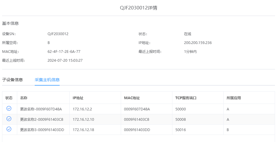 ① 可以通过点开M1200采集主机的设备详情,查看到当前有哪些M680通过这台M1200上线,还可以看到这些M680的状态和参数信息等